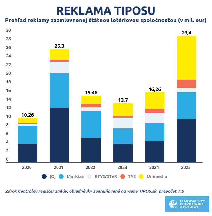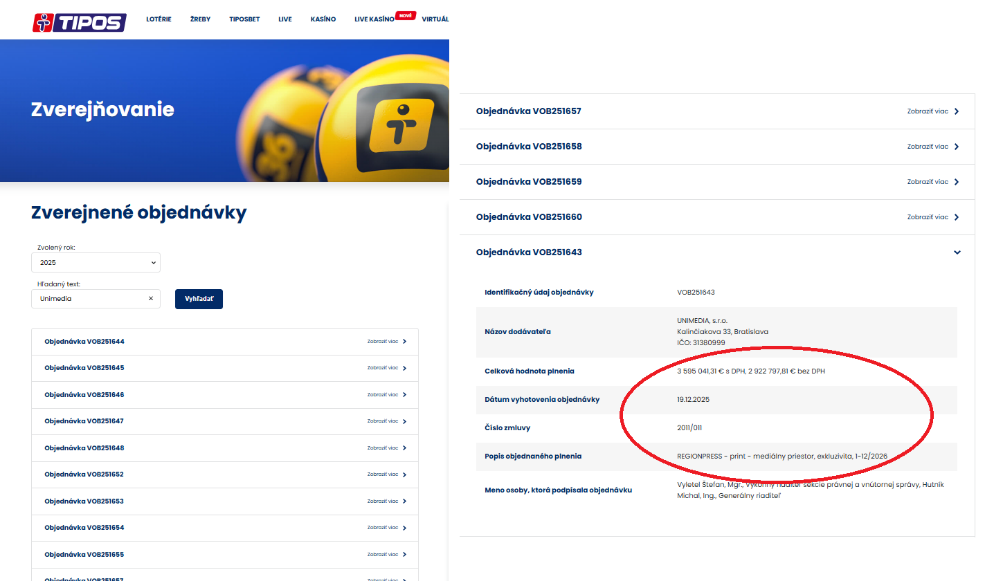 Počas minulých piatich rokov robil TIPOS v Unimedii ročné nákupy v rozmedzí 1,2 (2020) až 3,8 milióna eur (2024). Do desaťmiliónovej výšky ich vlani zdvihol najmä neobvyklý nákup mediálneho priestoru v spoločnosti REGIONPRESS za takmer štyri milióny. TIPOS si tu najprv kúpil mediálny priestor počas Vianoc za 285-tisíc eur a potom objednal aj inzerciu na celý rok 2026 za 3,6 milióna.