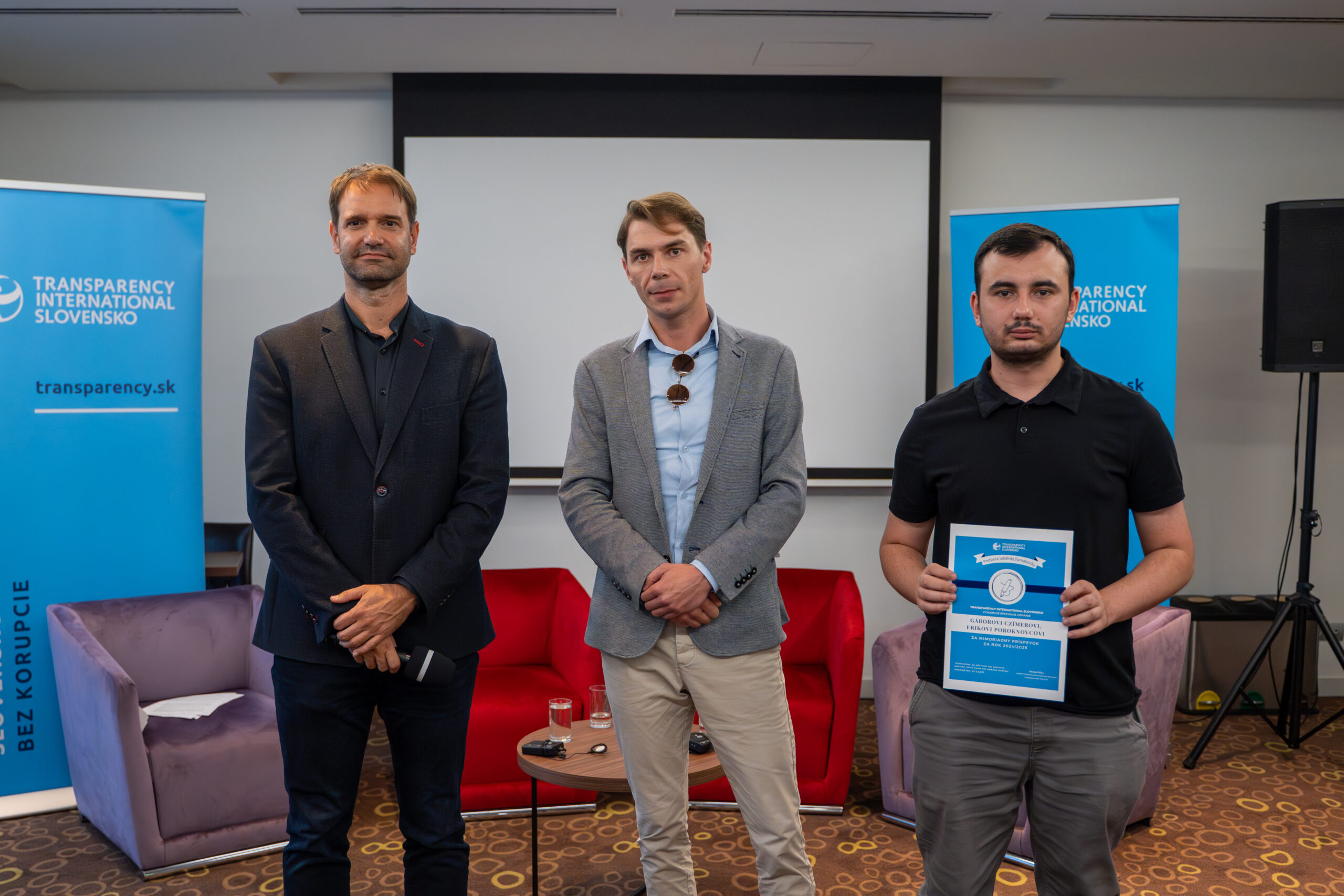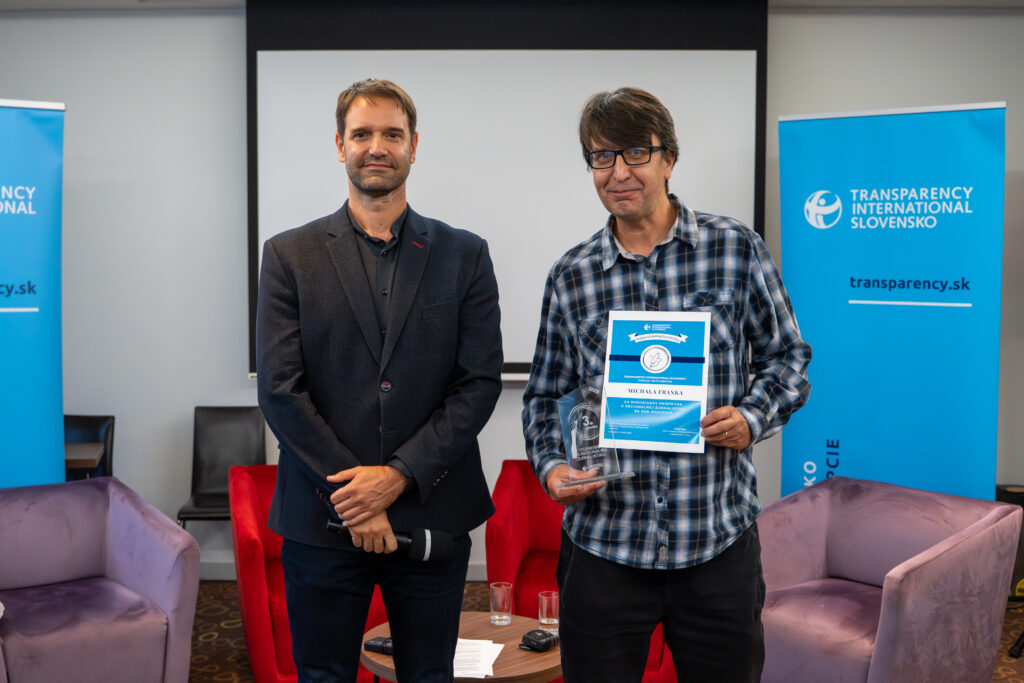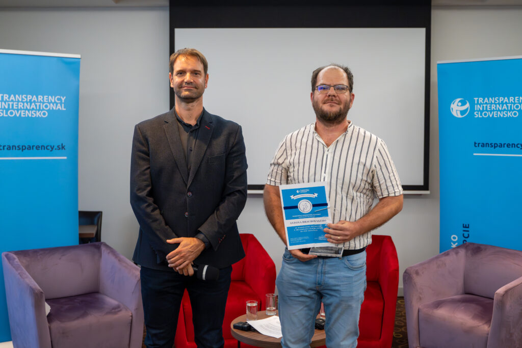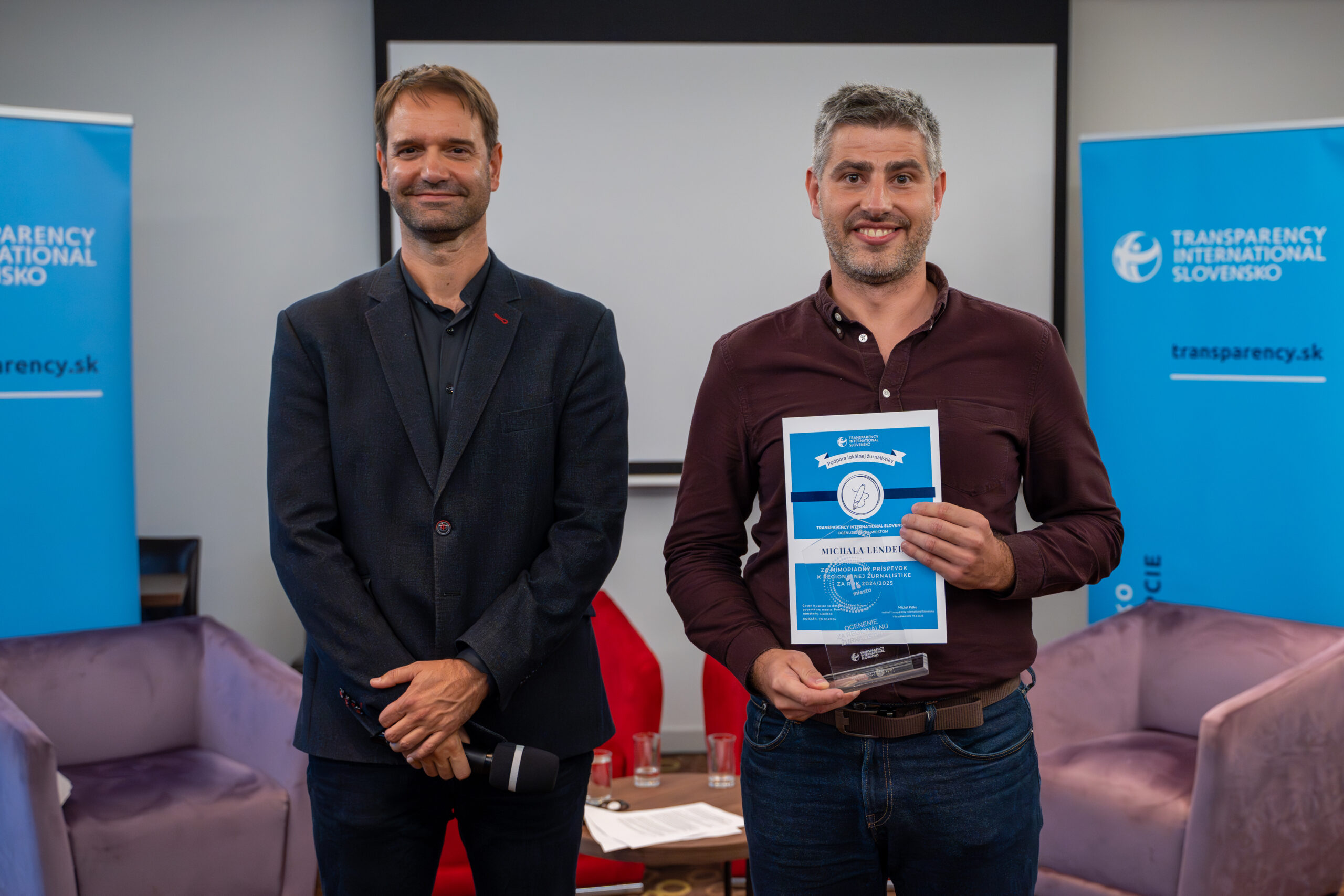 Víťaz Ocenenia Transparency International Slovensko za regionálnu žurnalistiku 2025 Michal Lendel z Korzára pri preberaní ceny od riaditeľa TIS Michala Piška.
